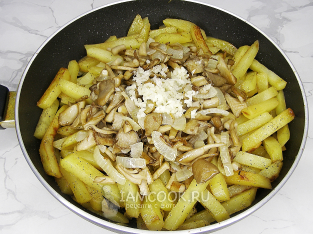 Добавляем в картофель обжаренные грибы с луком и измельчённый прессом чеснок.