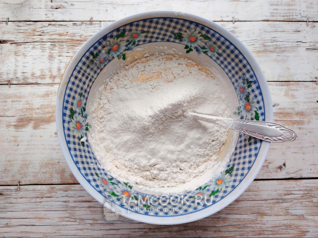 Всыпать просеянную муку, соединенную с разрыхлителем и ванилином.