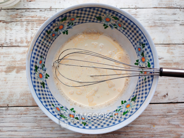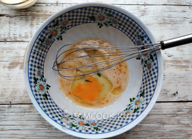 В глубокую посуду вбить яйца, всыпать сахар. Венчиком или миксером взбить смесь до полного растворения сахара.