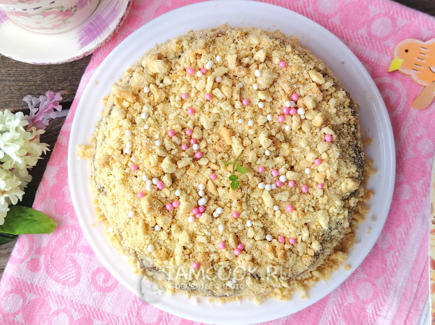 Собрать торт, присыпать верх и края крошкой, украсить по своему усмотрению, например, драже. Дать торту пропитаться в холодильнике не менее 5 часов, в идеале оставить на ночь.