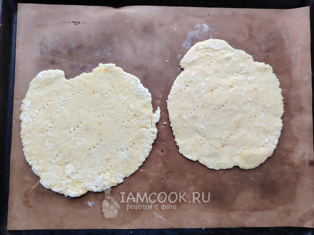 Раскатать каждую из них в круг толщиной около 0,3 см, наколоть вилкой, чтобы тесто не вздулось. Выложить на противень и отправить в духовку, прогретую до 180 градусов, на 10 минут. Песочные коржи выпекаются быстро, но нужно ориентироваться на работу своего духового шкафа.
