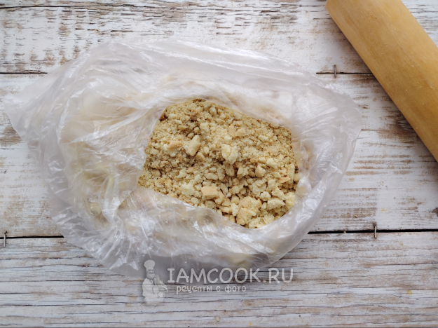 Крошки можно измельчить при помощи скалки, поместив остатки теста в пакет и прокатав их скалкой до измельчения.