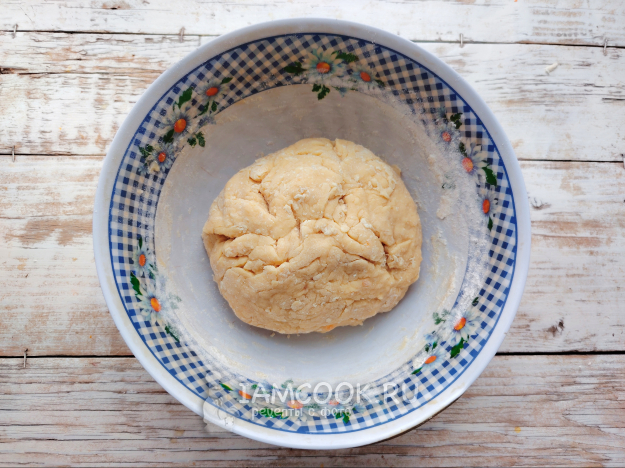 Замешать тесто. Песочное тесто не любит длительного замеса, поэтому следует быстро собрать тесто в шар, обернуть пищевой пленкой и убрать на полчаса в холодильник.