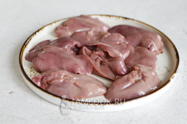 Куриную печенку промойте под проточной водой. Срежьте у нее пленочки, удалите сгустки крови. Нарежьте на одинаковые кусочки.