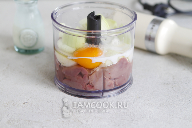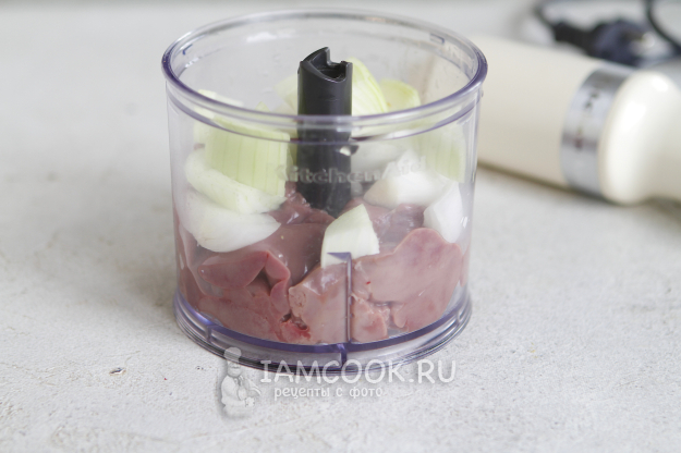 Почистите одну небольшую луковицу, нарежьте ее произвольно. Переложите вместе с печенкой в чашу блендера.