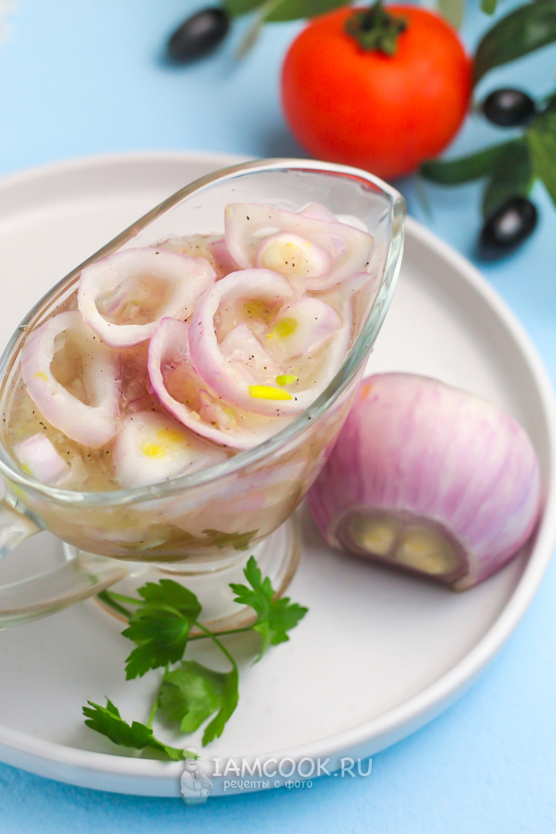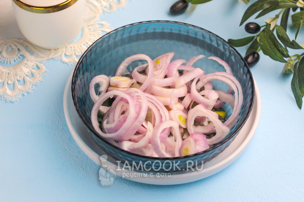 Нарежьте вторую луковицу кольцами, не слишком тонкими, чтобы они не порвались в процессе перемешивания. Влейте уксус, охлажденную кипяченую или минеральную воду и аккуратно все перемешайте.