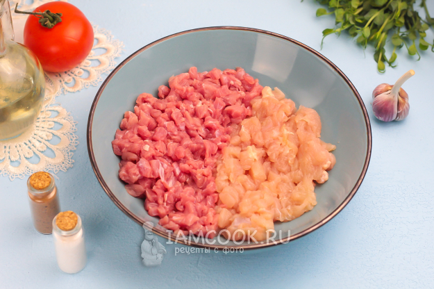 Промойте куриное филе и мякоть говядины, обязательно срежьте все жилы и пленки, которые могут скрутить мясо в процессе приготовления. Нарежьте мелкими кубиками и выложите в салатник, глубокую миску.
