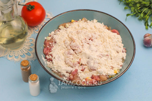 Всыпьте пшеничную муку и вмешайте ее в фарш. Оставьте его на 15 минут в покое.