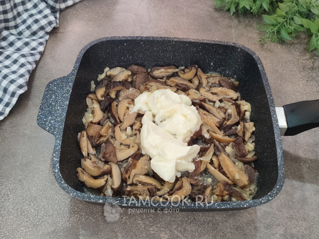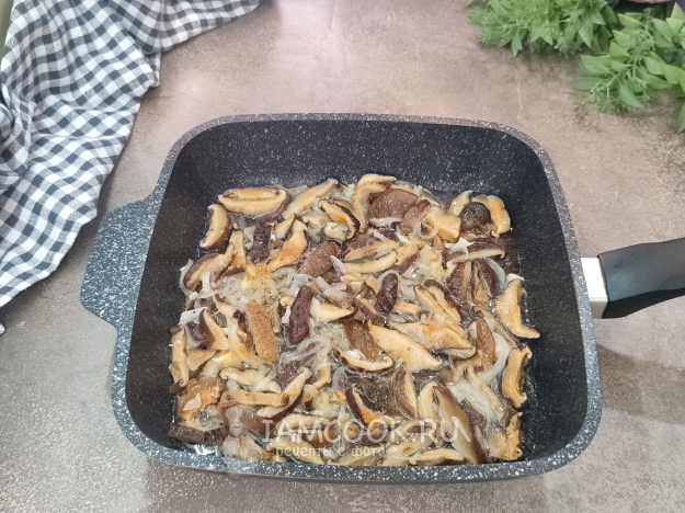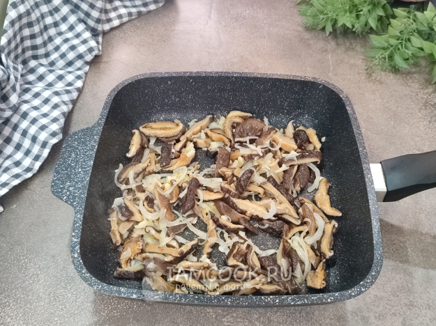 Добавьте грибы, обжарьте пару минут, помешивая.