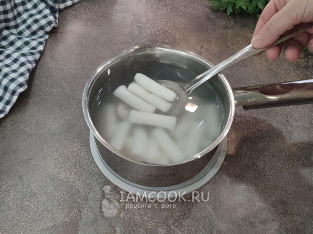 В кипящую воду опустите токпокки, варите 2 минуты, откиньте на сито.