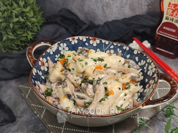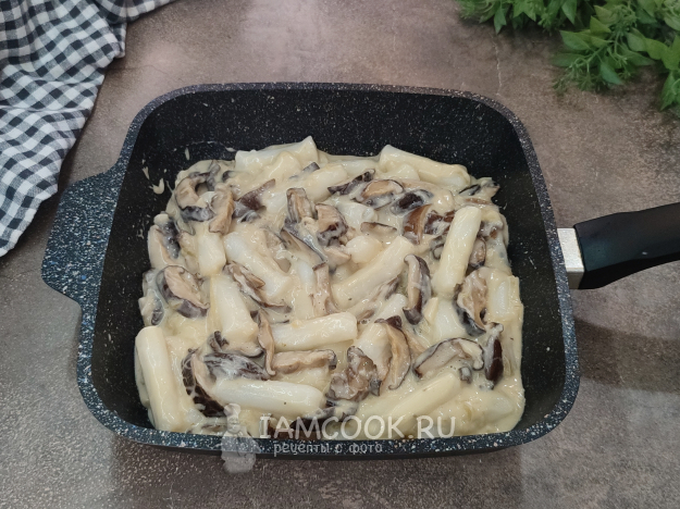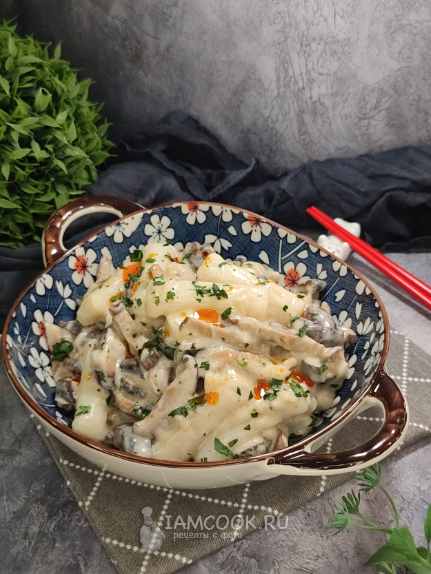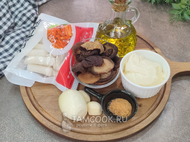 Соберите ингредиенты для приготовления готовых токпокки (магазинных). У меня сегодня шиитаке, но будет вкусно и с другими азиатскими грибами (эноки, еринги, шимеджи), и с вешенками или шампиньонами. Сухие грибы я предварительно замочила кипятком примерно на час, затем тщательно промыла. Из 40 граммов сухих у меня получилось 150 граммов восстановленных. Ножки у шиитаке довольно жесткие, их лучше срезать, можно оставить их для бульона, например.