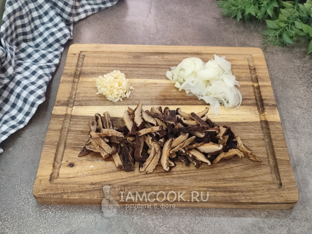 Нарежьте лук соломкой, чеснок измельчите. Шиитаке нарежьте ломтиками или соломкой.