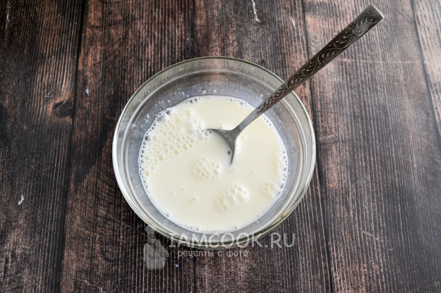 Как только молоко начнет закипать, влейте тонкой струйкой разведенный крахмал. Перед вливанием перемешайте, так как крахмал оседает на дно посуды.