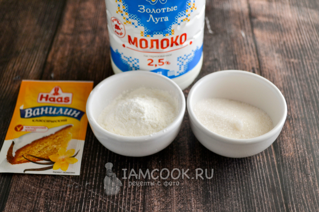 Соберите продукты для приготовления молочного пудинга с кукурузным крахмалом (без яиц).