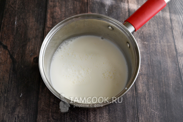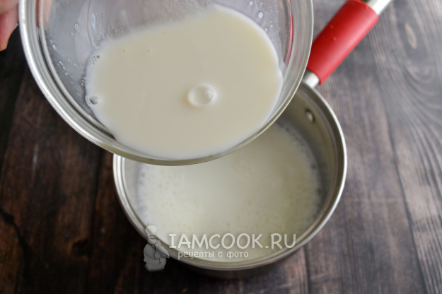 Оставшееся молоко (примерно 300 мл) налейте в сотейник или кастрюлю с толстым дном, добавьте щепотку соли и поставьте на огонь.