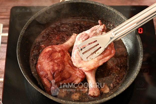 Периодически переворачивайте утиные ножки с бочка на бочок, чтобы они пропитались винным соусом со всех сторон.