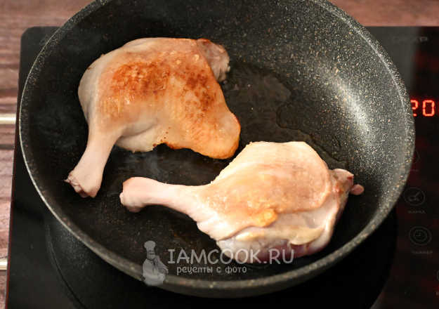 Раскалите сковороду без масла на максимальном огне. Выложите на раскалённую сковороду утиные ножки кожей вниз.