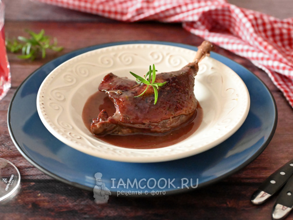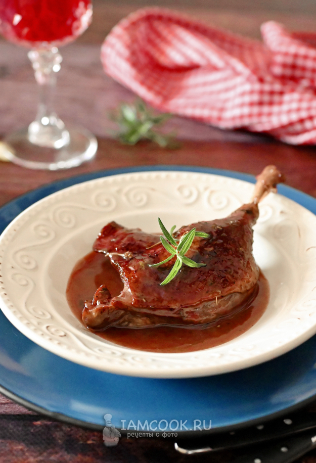 Выложите утиную ножку на тарелку и полейте винным соусом, в котором она томилась.