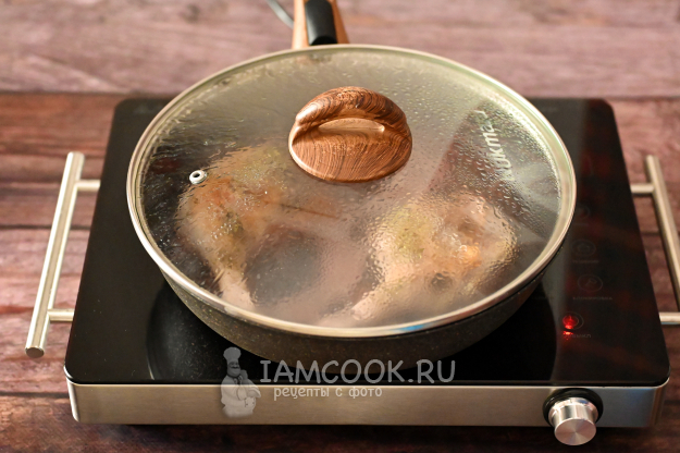 Накройте сковороду крышкой и после закипания убавьте огонь до минимального.
