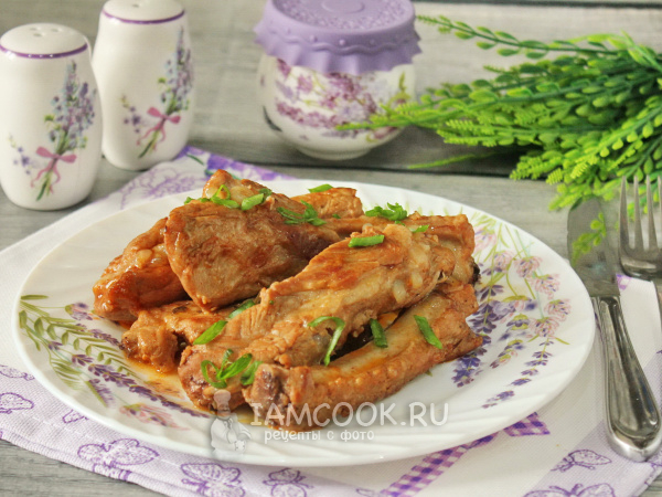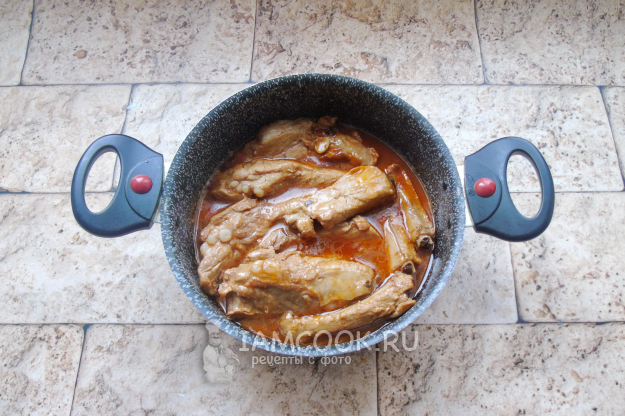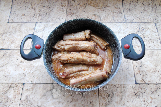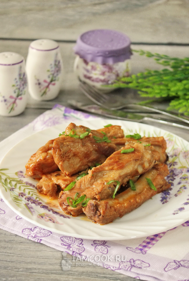 Накройте крышкой и тушите ребрышки на огне ниже среднего, пока мясо не станет мягким и не будет легко отходить от кости. Если в процессе приготовления соус частично выкипит, то налейте 70-100 мл воды.