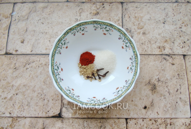 Пока ребра жарятся, займитесь соусом. В миску насыпьте сахар, соль, молотый имбирь, корицу. Красный, черный и белый молотый перцы, добавьте гвоздику.