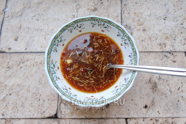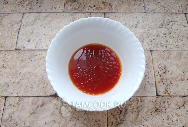Приготовьте маринад. В мисочку налейте белое вино, соевый соус, яблочный уксус, кунжутное масло. Добавьте сахар и томатную пасту, перемешайте.