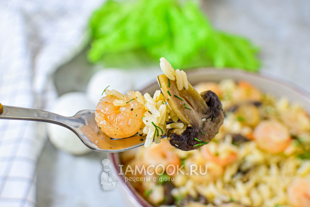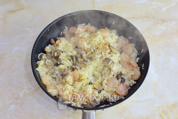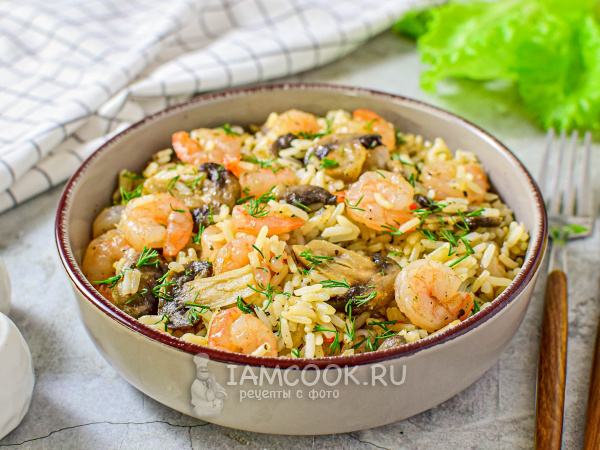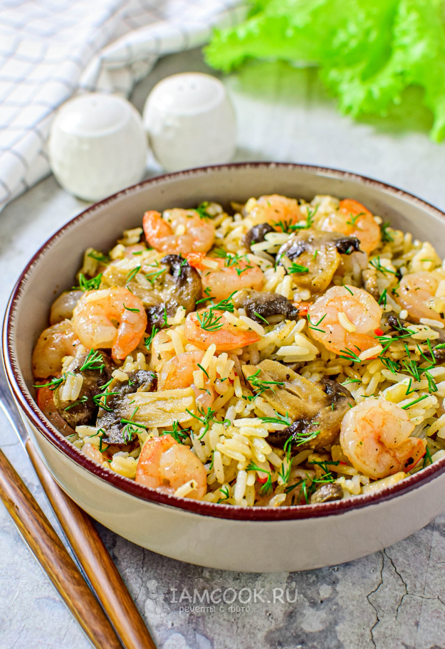 Рис с креветками и грибами разложите по тарелкам и подавайте к столу.