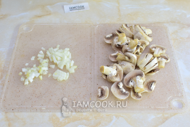 Лук очистите и мелко нарежьте. Грибы промойте и нарежьте ломтиками.