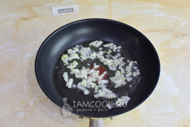 На горячую сковороду налейте немного растительного масла и обжарьте лук 1-2 минуты.