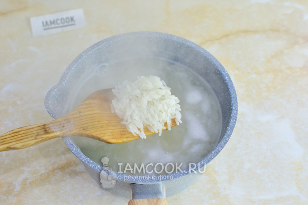 Сразу отварите рис. На варку обычно уходит 12-15 минут. Рис увеличится в размере и станет мягким. Откиньте его на дуршлаг и пролейте холодной водой.