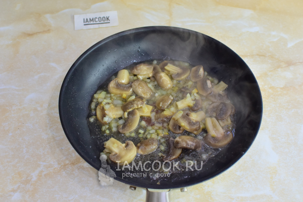 Добавьте в сковороду шампиньоны. За время жарки они немного уменьшатся в размере. Дождитесь, чтобы испарилась вся жидкость.
