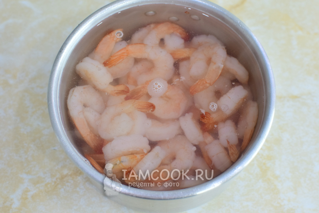 Креветки опустите в кипящую воду и доведите ещё раз до кипения. Проварите их 1-2 минуты. Затем воду слейте. Креветки немного остудите и удалите хвостики.