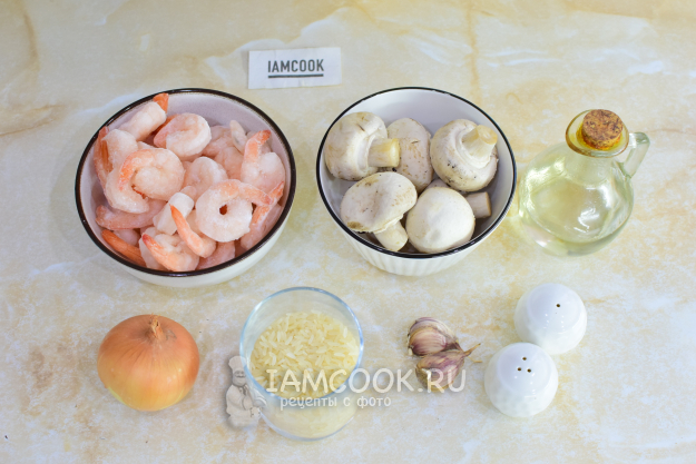Чтобы приготовить рис с креветками и грибами на сковороде, соберите необходимые ингредиенты по списку. Грибы могут быть шампиньоны или лесные.