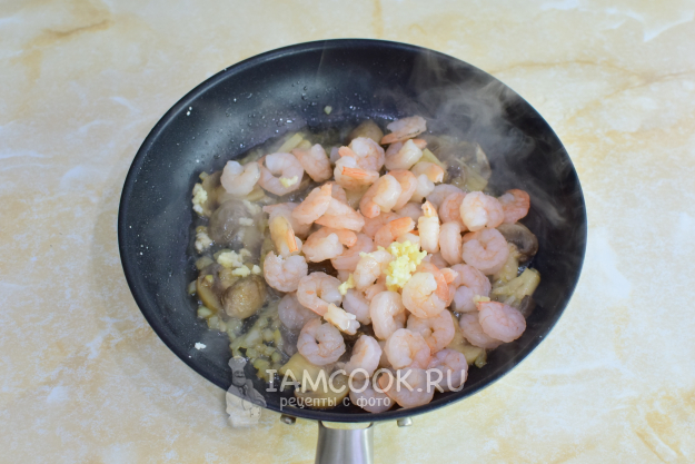 Затем выложите к грибам креветки и пропустите через пресс пару зубчиков чеснока.