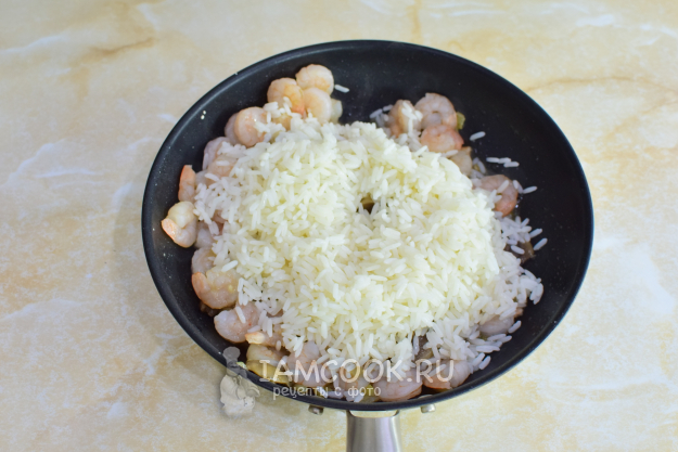 Добавьте отварной рис. Все перемешайте. По вкусу подсыпьте соль и специи. Прогрейте все вместе еще 2-3 минуты.