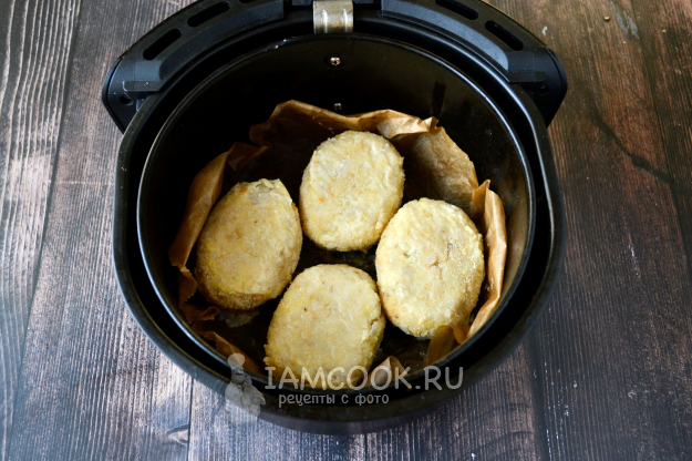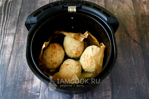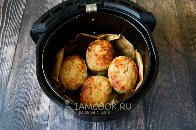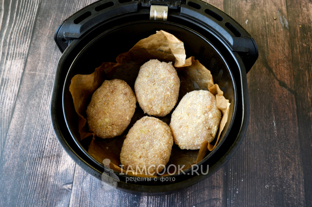 Включите аэрогриль для разогрева на 5-7 минут при температуре 200°С. Затем в чашу аэрогриля положите котлеты. Можно положить на пекарскую бумагу, в которой сделать несколько проколов ножом. Если без бумаги, то нужно смазать чашу аэрогриля растительным маслом. Можно положить котлеты в форму для запекания.