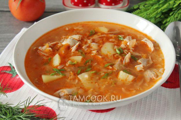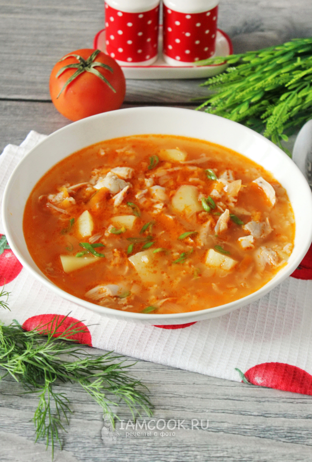 Томатный суп с курицей и рисом готов.