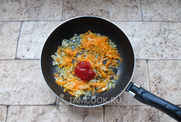 Пассеруйте овощи на небольшом огне до прозрачности лука. После добавьте томатную пасту или протертые помидоры. Перемешайте с морковью и луком. Пассеруйте еще 4-5 минут.