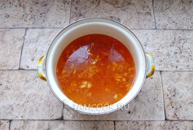 Добавьте зажарку в кастрюлю с супом. Посолите, поперчите, насыпьте сладкую молотую паприку. Варите суп до готовности всех ингредиентов.