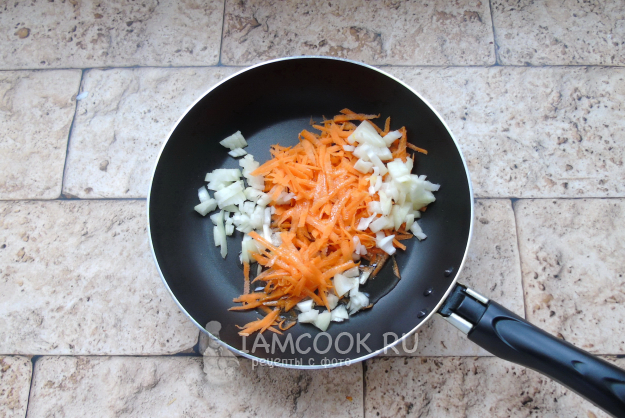 Тем временем репчатый лук мелко нарежьте, а морковь натрите на терке. Выложите в сковороду с растительным маслом.