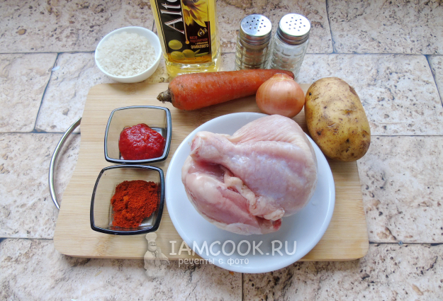 Соберите ингредиенты для приготовления томатного супа с курицей и рисом.