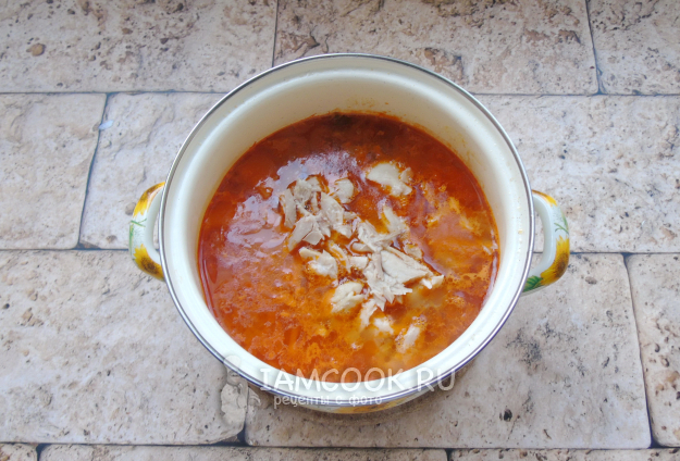 Добавьте курицу в готовый суп и перемешайте.