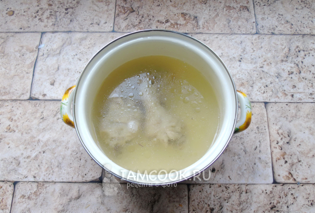 Любые мясистые части курицы помойте и выложите в кастрюлю, залейте водой. Доведите до кипения, после огонь убавьте до минимума и снимите пену. Крышку кастрюли слегка приоткройте и варите курицу до мягкости.