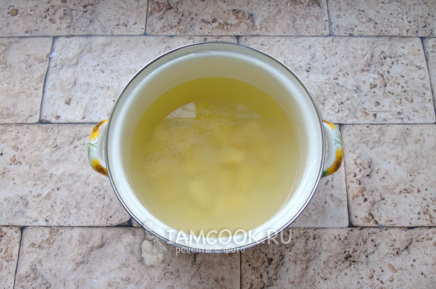 Вареную курицу выложите из кастрюли на тарелку. В бульон добавьте нарезанную картошку и начинайте варить суп.
