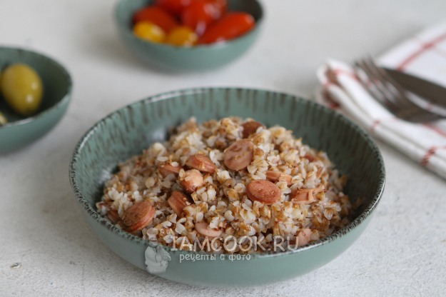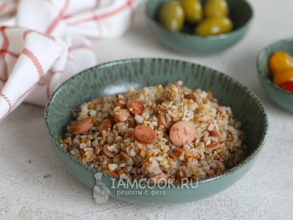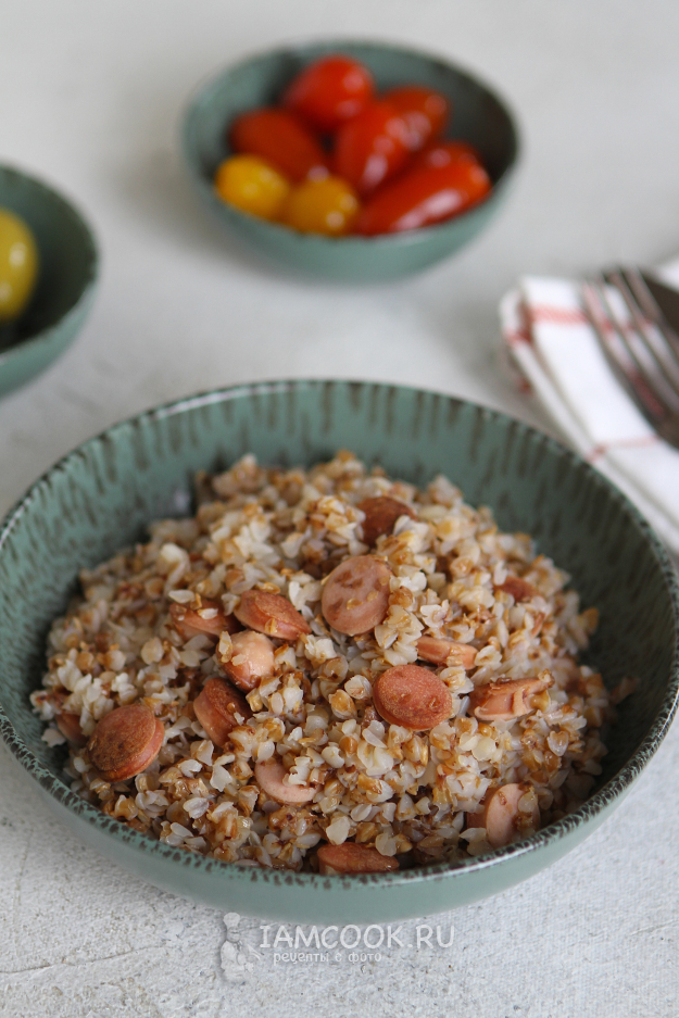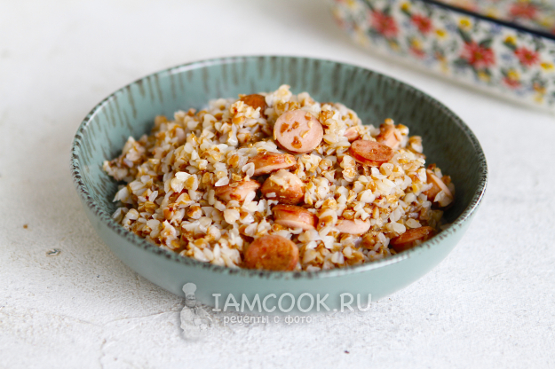 Перемешайте гречку с сосисками и разложите по тарелкам.