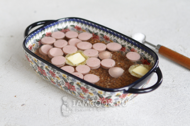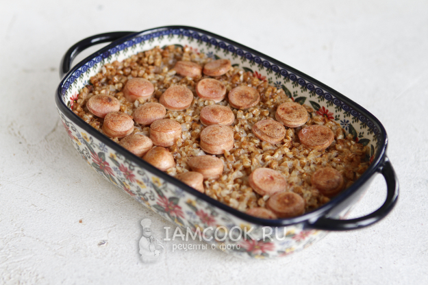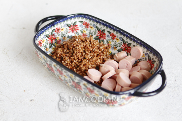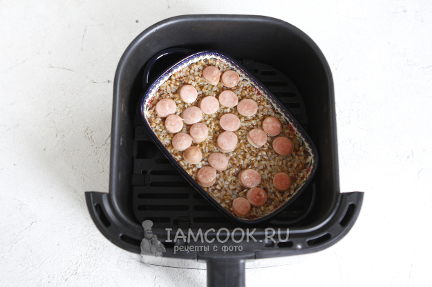 Подготовьте подходящую форму для аэрогриля. Переложите в нее гречку и сосиски.