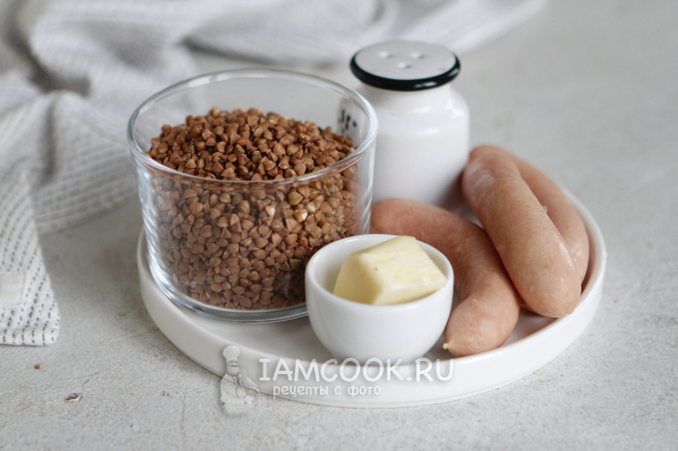 Соберите все продукты по списку и приступим к приготовлению гречки с сосисками в аэрогриле.