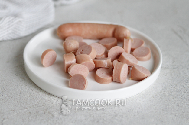 Сосиски, у меня куриные, нарежьте на одинаковые кусочки.