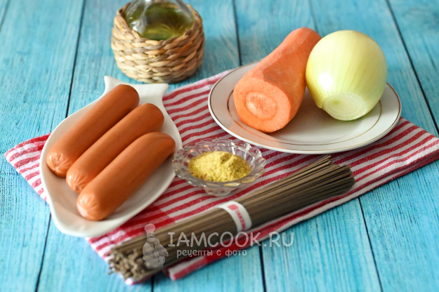 Соберите необходимые продукты для приготовления гречневой лапши с сосисками.