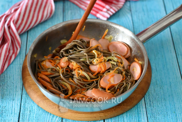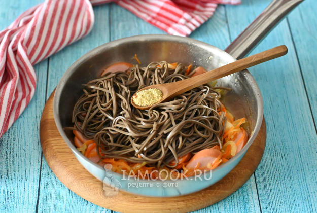 Отваренную гречневую лапшу отправьте в сковородку к сосискам. Добавьте сюда же сухой куриный бульон.